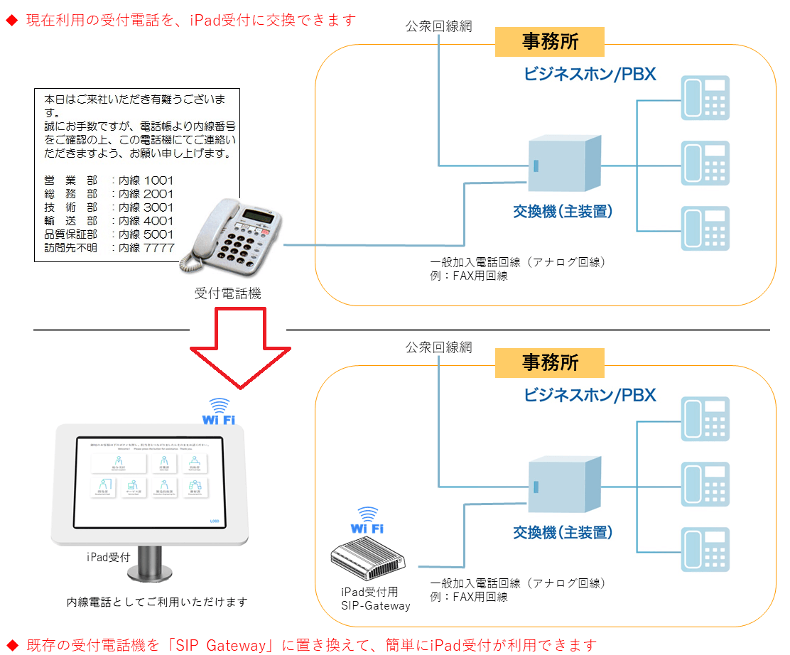レガシー ビジネスフォンにiPad受付が接続できます。