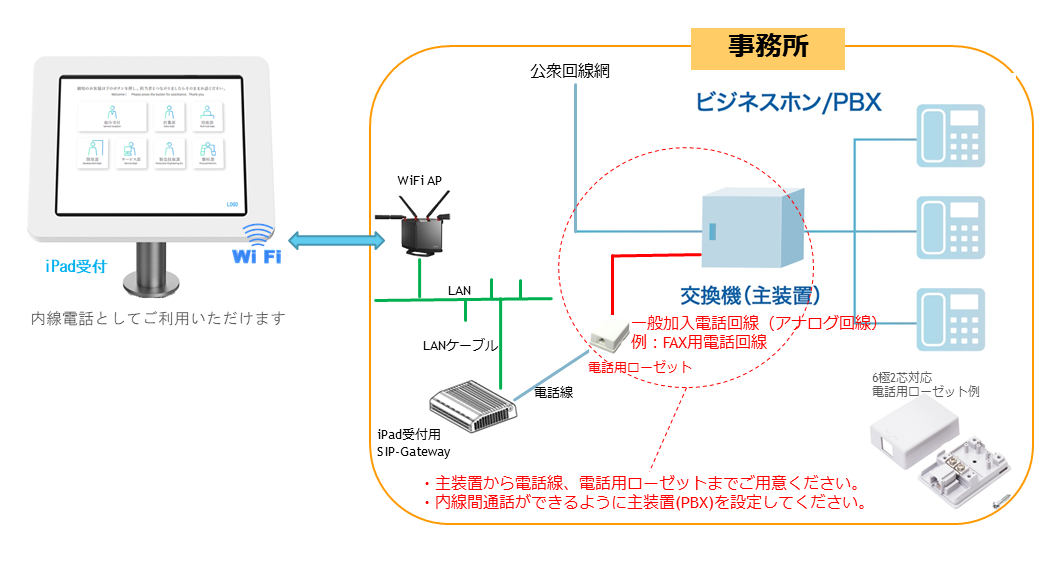 アナログ電話回線とWiFiを中継し、iPadを交換機に接続します